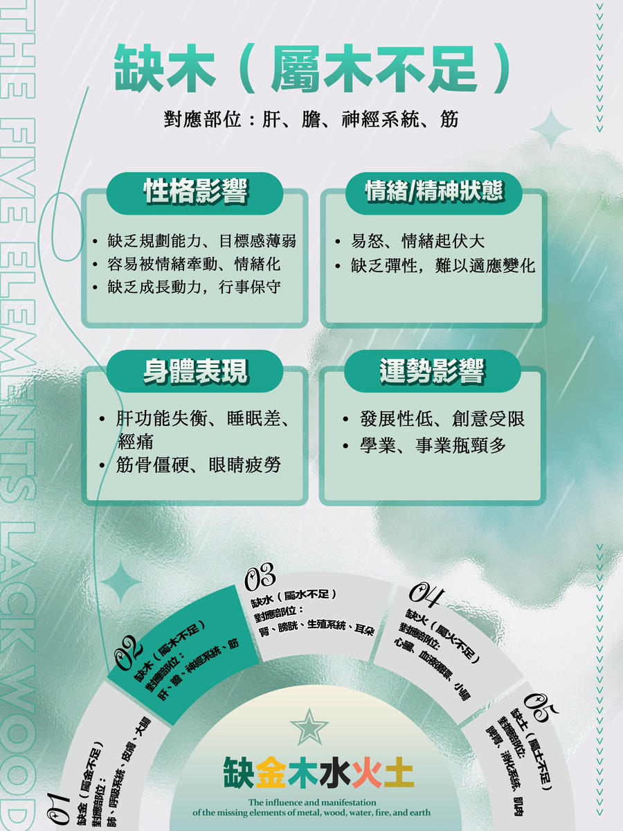 • 人際不順:木不足,代表貴人運差,人脈拓展困難。